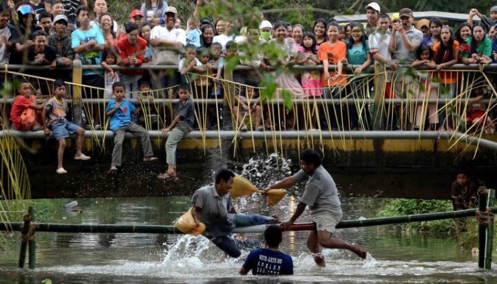 Mereka yang bertanding, akan saling gebuk (pukul) dan menyerang lawan permainan. Peserta yang tidak dapat menjaga keseimbangannya maka akan tercebut ke air. Sedangkan peserta yang dapat bertahan diatas bambu atau kayu, akan jadi pemenangnya.
