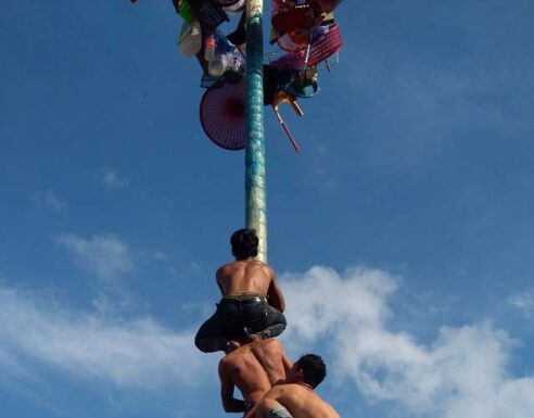 Pohon pinang yang dilumuri oli atau minyak, membuat para peserta lomba harus berjuang keras memanjat untuk dapat mengambil hadiah yang sudah diikat di bagian paling atas batang pinang.