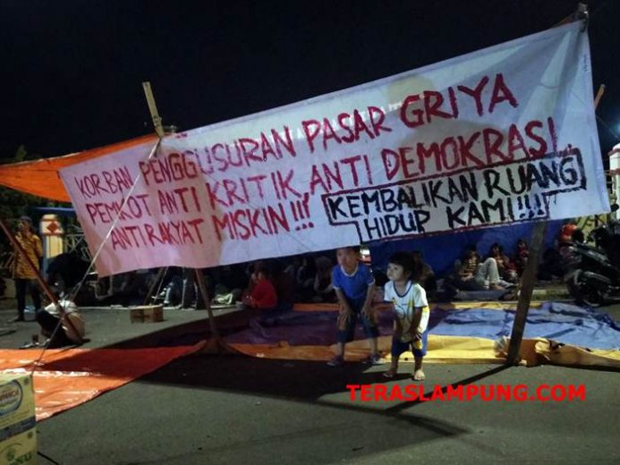 Mereka membuat tenda di depan rumah dinas walikota disebabkan warga dipaksa keluar alias digusur dari Pasar Griya Sukarame Bandarlampung. Pasar Griya Sukarame dan puluhan rumah warga kini sudah rata dengan tanah.
