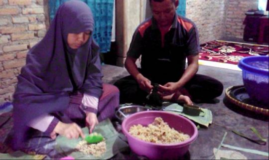 “Nasi bakar ini bahannya dari beras yang dimasak terlebih dulu lalu di karon (dicampur) pakai aneka racikian bumbu. Prosesnya butuh waktu dua jam. Setelah itu, nasi didinginkan terlebih dulu,baru diberi isian daging, telur puyuh dan daun kemangi lalu dibungkus daun pisang,”tuturnya saat ditemui teraslampung.com di rumahnya, Rabu 13 Februari 2019 sore.