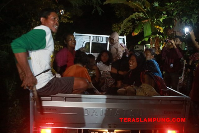 Sementara ratusan warga dari dua desa yakni Desa Banyumas dan Beringin Kencana, hingga malam ini masih dilakukan evakuasi oleh petugas BPBD dan Polres Lampung Selatan menggunakan perahu karet. Selanjutnya ratusan warga yang dievakuasi itu, dibawa menggunakan kendaraan mobil petugas menuju ke tempat pengungsian di gedung muslimat komplek Masjid Roudhatul Hidayah Desa Beringin Kencana.