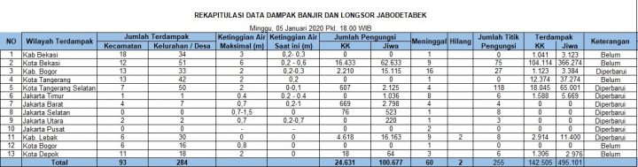 TERASLAMPUNG.COM — Badan Nasional Penanggulangan Bencana (BNPB) merilis jumlah korban meninggal dunia dalam musibah banjir dan longsor di Jakarta, Bogor, Tangerang, Bekasi (Jabodetabek) dan Banten hingga tanggal 5 Januari 2020, pukul 18.00 WI...