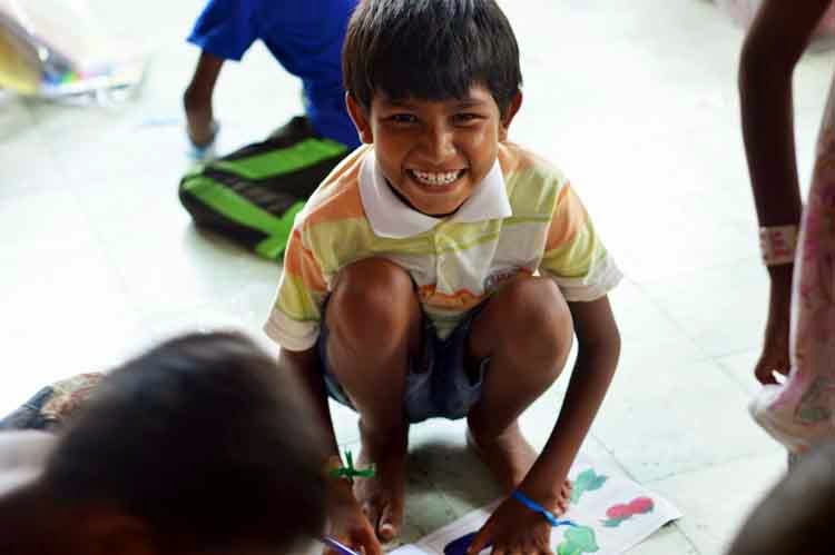 Seorang anak pengungsi Muslim Rohingya di Aceh tampak senang ketika menerima buku mewarnai dari RUMAN Aceh. |