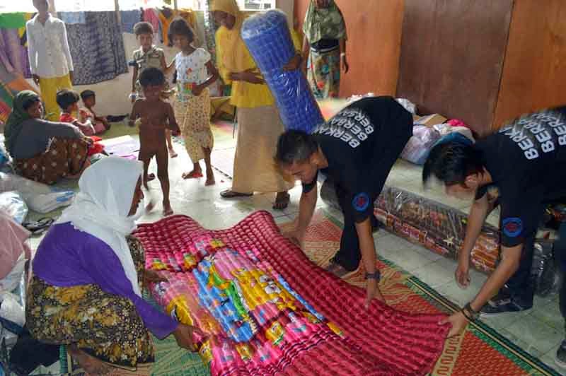 Relawan RUMAN Aceh mengantas kasur bantan untuk pengungsi Rohingya. |
