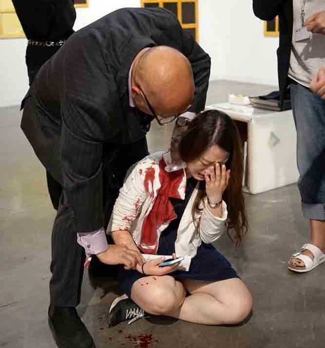 Saat lengan dan leher perempuan muda yang belum diketahui identitasnya mengaduh dan berteriak kesakitan, barulah para pengunjung sadar bahwa aksi seniman bernama Siyuan Zhao (24 tahun) itu bukan bagian dari pameran seni.