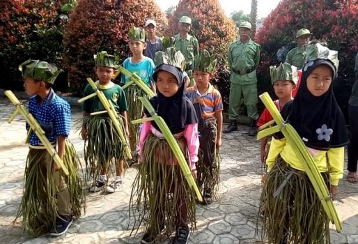 Kemudian ada beberapa anak kecil yang mengenakan atribut bak tentara perang zaman dulu, uniknya atribut yang digunakan anak-anak ini seperti senjata tembakan dibuat dari batang daun pisang. Lalu topi dibuat dari dari daun nangka dirangkai menggunakan batang lidi daun kelapa, dan pakaian bawah dibuat dari daun kelapa berbentuk rumbai.