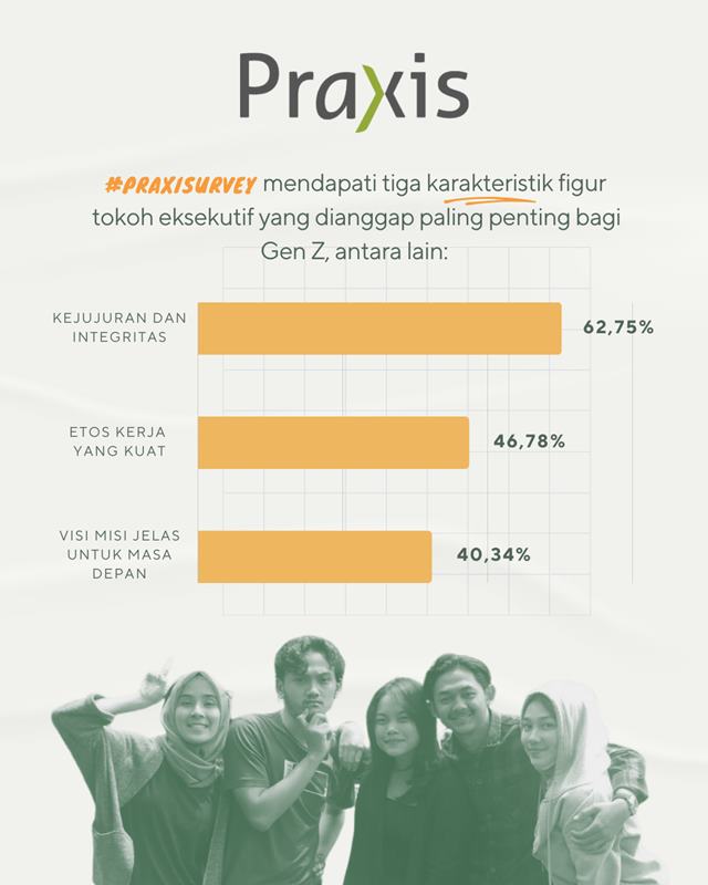 Selain kepuasan terhadap layanan publik, survei Praxis juga mencari tahu preferensi responden terhadap pemimpin yang ideal. Praxis mendapati tiga karakteristik figur tokoh eksekutif yang dianggap paling penting bagi Gen Z, antara lain: kejujuran dan integritas yang tinggi (62,75 persen), etos kerja yang kuat (46,78 persen), dan visi misi yang jelas untuk masa depan (40,34 persen).
