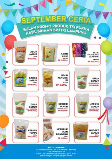 Selalama Bulan Promosi Produk TKI Purna, digelar aneka kegiatan. Antara lain: setiap hari kerja selama bulan September 2017, di halaman kantor BP3TKI Lampung. setiap minggu pagi di gelaran Car Free day Tugu Adipura Kota Bandarlampung.