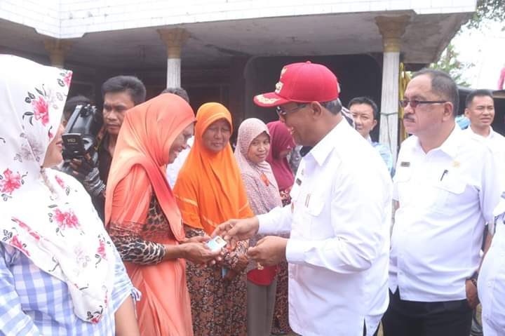 Sebelum melakukan pengguntingan pita dan penanda tanganan prasasti, Bupati Lamteng Loekman Djoyosoemarto terlebih dahulu membagikan e – KTP secara simbolis kepada warga dari dinas catatan sipil kabupaten Lamteng.