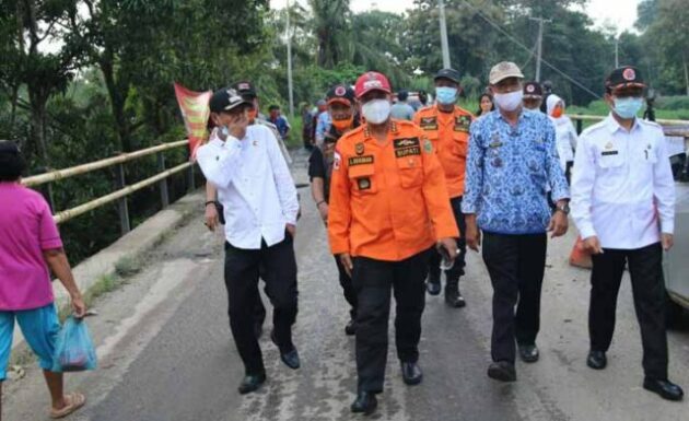 LAMPUNG TENGAH — Bupati Lampung Tengah (Lamteng) Loekman Djoyosoemarto meninjau jembatan yang ambrol di Jalan Raya Komring Putih Kecamatan Gunungsugih, Rabu (17/6/2020).