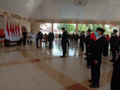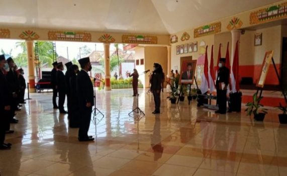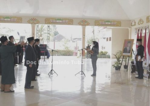 TERASLAMPUNG.COM — Pemerintah Kabupaten Tulangbawang menggelar Upacara pelantikan dan pengambilan sumpah pejabat fungsional dengan tetap melaksanakan protokol kesehatan, di Gedung Serba Guna Menggala, Kabupaten Tulangbawang, Senin (24/5/2021).