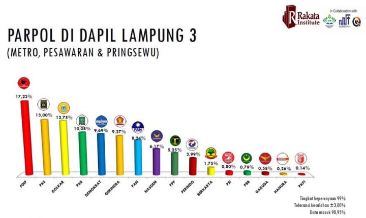 Berdasarkan data quick count Rakata Institute, di dapil Lampung 3 (Metro, Pesawaran, Pringsewu) perolehan suara PDIP tertinggi dibanding partai lain (17,23 persen). PKS menyusul dengan peroelehan suara 13.00 persen, kemudian Golkar (12,75 persen), PKB (10,98 persen), Demokrat (9,69 persen), Gerindra (9,27 persen), PAN (8,24 persen), Nasdem (6,17 persen), PPP (5,25 persen), Perindo (3,99 persen), Berkarya (1,75 persen), PSI (0,80 persen), PBB (0,79 persen), Garuda (0,58 persen), Hanura (0,26 persen), dan PKPI (0,14 persen).