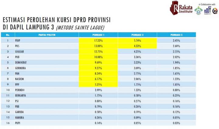 TERASLAMPUNG.COM — Rakata Institute bersama UIN Raden Intan, ALSHCI, dan lembaga survei Quadran merilis hasil hitung cepat perolehan suara Pemilu 2019 di Lampung, Rabu-Kamis dini hari (17-18/4/2019). Perhitungan cepat itu dengan data C1 di 746 TPS.