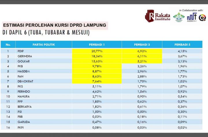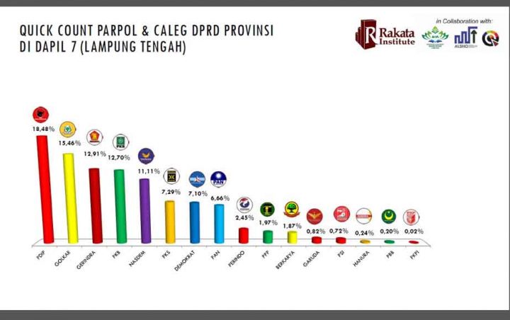 Berdasarkan hasil hitung cepat Rakata Institute bersama UIN Raden Intan, ALSHCI, dan lembaga survei Quadran pada Rabu-Kamis dini hari (17-18/4/2019), PDIP dan Gerindra bersaing ketat.