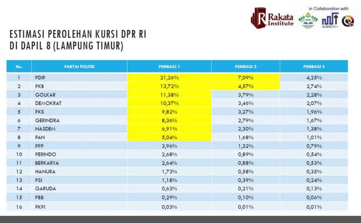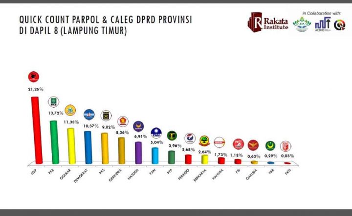 Berdasarkan data quick count Rakata Institute, di dapil Lampung 8 (Lampung Timur) PDIP, PKB, dan Golkar memperoleh suara lebih baik dibanding parpol lain. Meskipun begitu, perolehan suara PDIP masih jauh di atas perolehan suara PKB dan Golkar.