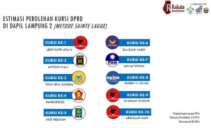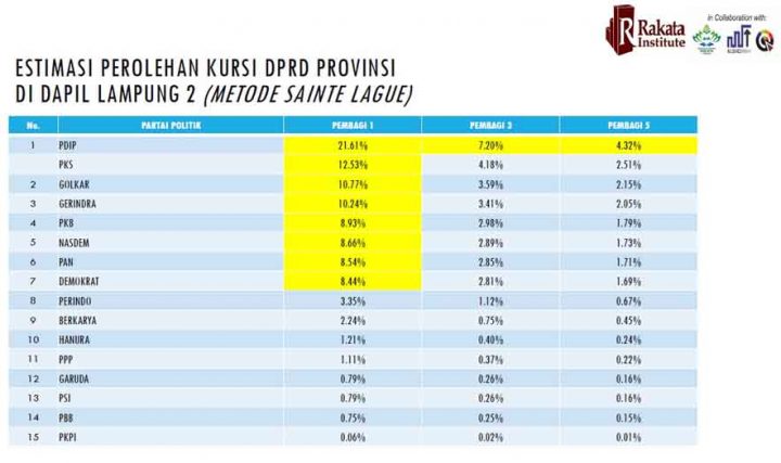 Ada 10 kursi DPRD Lampung yang diperiebutkan di dapil Lampung 2 (wilayah Lampung Selatan). Dengan gambaran perolehan suara seperti itu, jika dihitung dengan metode Sainte Lague, maka PDIP berpeluang meraih 3 kursi, sementara PKS meraih2 kursi. Sedangkan Golkar, PKB, Demokrat, Gerindra, PAN, Nasdem, dan PPP masing-masing 1 kursi.