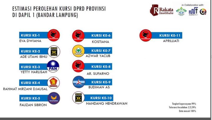 Golkar, Demokrat, Nasdem, dan PAN masing-masing memperoleh 1 kursi. Namun, semua hasil ini barulah hasil perlkiraan berdasarkan hitung cepat Rakata Institute yang mengambil data dari sejumlah TPS. Hasil akhirnya masih tetap harus menunggu penghitungan suara KPU.