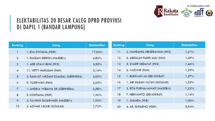 Para caleg yang memperoleh suara besar di Dapil Bandarlampung antara lain adalah Eva Dwiana (PDIP), sebesar 17,02 persen, disusul Fauzan Sibron (Nasdem) 4,82 persen, Ade Utami Ibnu (PKS) 3, 55 persen, Yeti Harlisah (PAN) 3, 14 persen, Rahmat Mirzani Djausal (Gerindra) 3,02 persen.