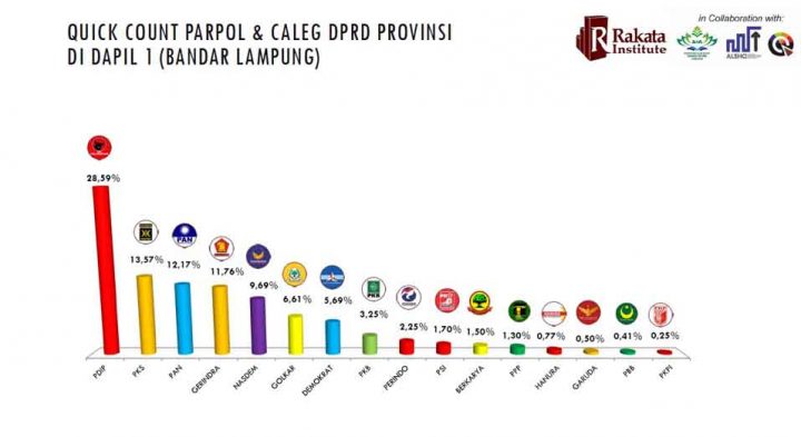Berdasarkan hasil hitung cepat (quick count) Rakata Institute yang dilakukan pada 17-18 April 2019, PDIP menjadi partai yang berjaya dalam mengumpulkan suara. Untuk caleg DPRD Lampung, di daerah pemilihan I (Dapil I) ini, partai banteng moncong putih meraup 28,59 persen.