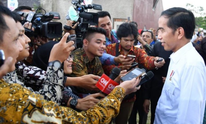 Merasa banyak wartawan yang matanya melotot ke arah kakinya, Presiden Jokowi pun nyeletuk disertai senyumnya khasnya, “Melihat bawah terus, ada apa sih?”