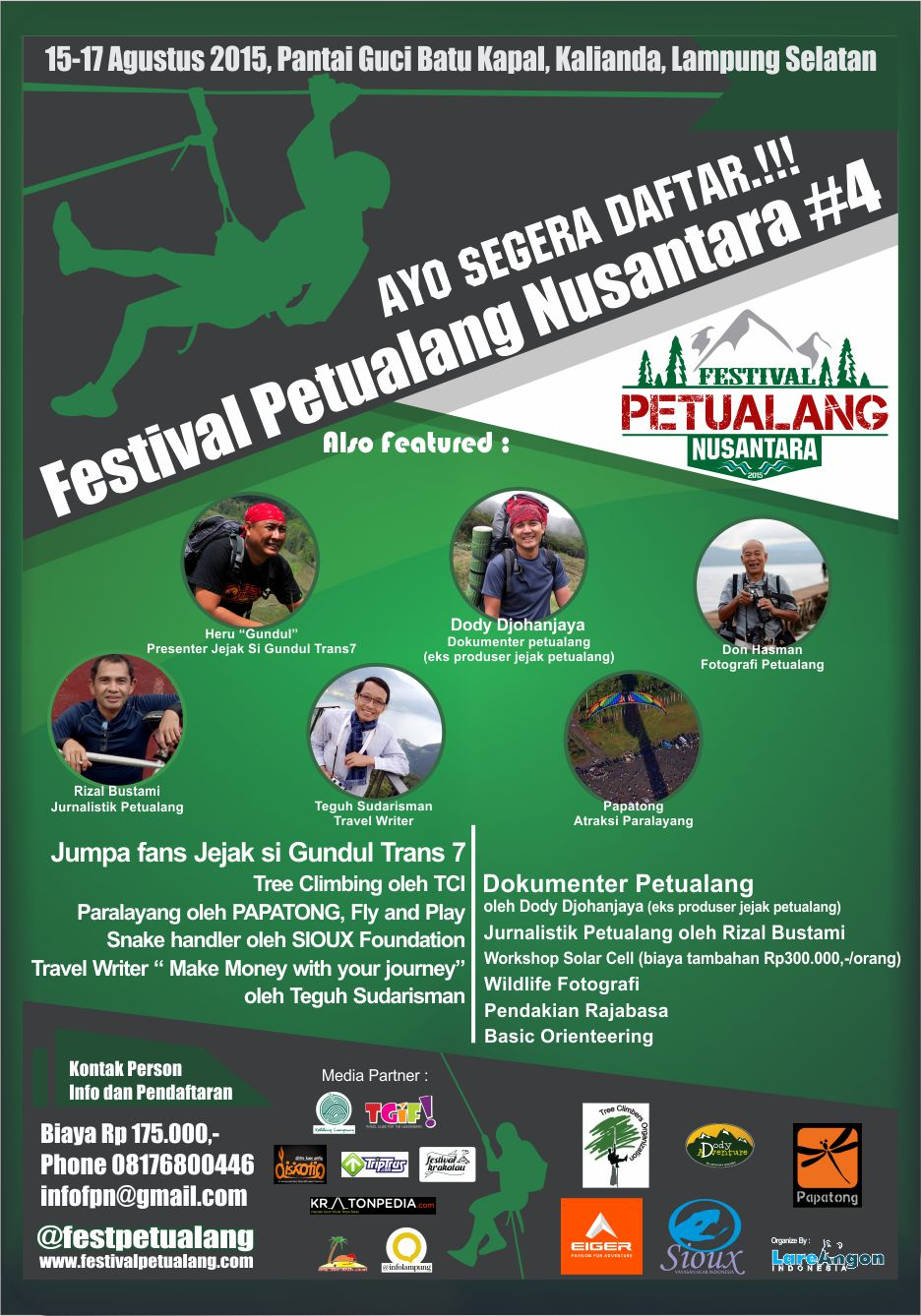Poster kegiatan FPN di Anak Gunung Krakatau (15–17/8) di Kalianda, Lampung Selatan Jakarta, Teraslampung.com—Dalam menyambut Hari Kemerdekaan RI yang ke 70, Festival Petualang Nusantara (FPN) kembali diseleggarakan. Bekerj...