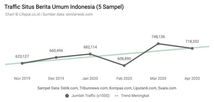 Kebutuhan masyarakat akan berita tampaknya juga meningkat secara signifikan di masa pandemi Covid-19. Terbukti, lima sampel situs berita umum, yakni Detik.com, Tribunnews.com, Kompas.com, Liputan6.com, dan Suara.com, yang dianalisis Lifepal.co.id menunjukkan tren meningkat.