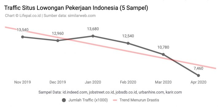 Namun, data menunjukkan, kunjungan ke lima situs lowongan pekerjaan yang dijadikan sampel, yakni Indeed.com, Jobstreet.co.id, JobsDB.co.id, Urbanhire.com, dan Karir.com, justru menurun. Bahkan, penurunannya sudah terjadi sejak bulan Februari dan terus menurun hingga April.