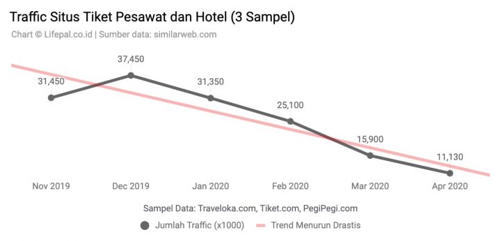 “Penurunan total trafik ke tiga situs tersebut sudah terjadi sejak bulan Januari 2020. Jika dibandingkan dengan puncak trafik pada bulan Desember 2019, traffic pada bulan April 2020 telah berkurang lebih dari 70%. Trend ini dikhawatirkan masih akan terus menurun dengan pembatasan mudik oleh pemerintah,” tulis Lifepal.