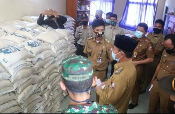 Plt. Budi Utomo memeriksa kondis beras yang akan diberikan kepada warga.
