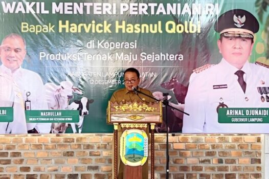 Hal itu disampaikan Gubernur Arinal Djunaidi saat mendampingi Wakil Menteri Pertanian Harvick Hasnul Qolbi melakukan kunjungan kerja ke Koperasi Produksi Ternak (KPT) Maju Sejahtera di Kecamatan Tanjungsari Kabupaten Lampung Selatan, Selasa (12/12/2023).