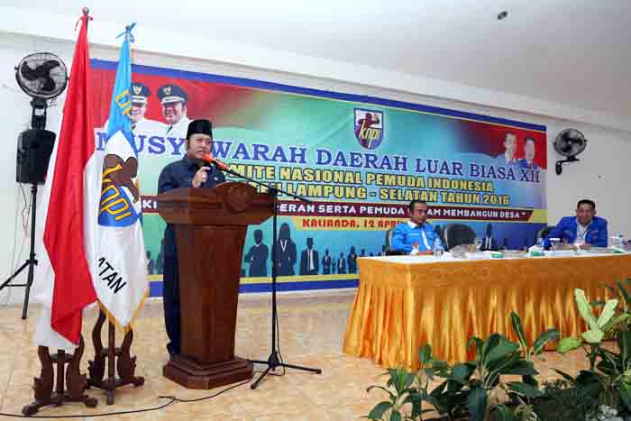 | Bupati Zainuddin Hasan memberikan sambutan pada Musda KNPI Lampung Selatan di Gedung PKK Kalianda, Lampung Selatan, Selasa (12/4). |