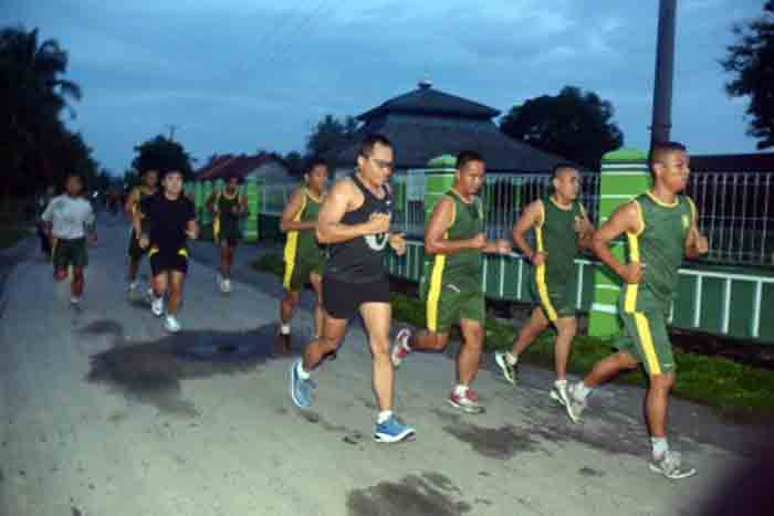 | Danren Gatam Koolonel Joko Putranrto melakukan pembinaan fisik dengan lari 10 kilometer, Kamis pagi (21/4). |