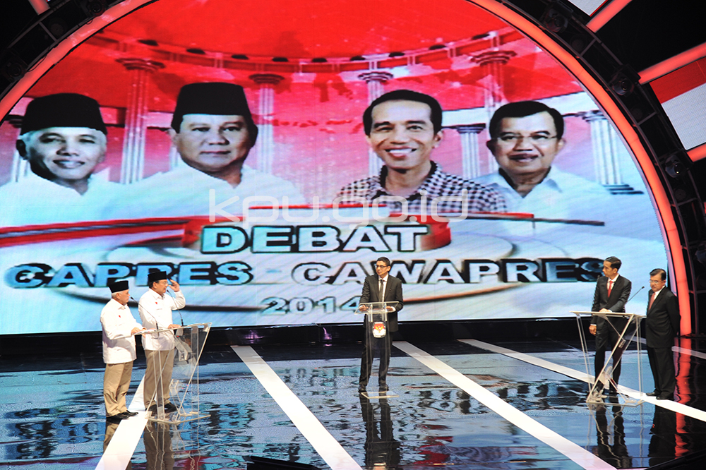 JAKARTA—Debat calon presiden (capres) dan calon wakil presiden (cawapres) Prabowo-Hatta dan Joko Widodo- Jusuf Kalla di Balai Sarbini dan ditayang secara live oleh seluruh media televisi, Senin (9/6) malam,