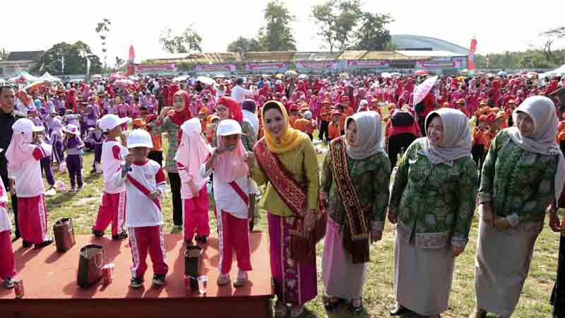BANDARLAMPUNG, Teraslampung.com — Bunda Pendidikan Anak Usia Dini (PAUD)Provinsi Lampung, Aprilani Yustin Ficardo, menghadiri pemecahan rekor Museum Rekor Indonesia (MURI) sikat gigi masal anak usia dini di Stadion Tejosari, Kota Metro, Jumat (1/4/2016).