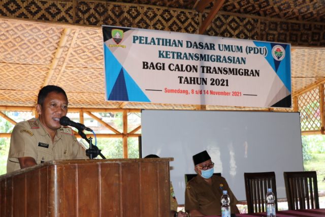 TERASLAMPUNG.COM, SUMEDANG — Direktur Fasilitas Penataan Persebaran Penduduk di Kawasan Transmigrasi Anto Pribadi membuka Pelatihan Dasar Umum Ketransmigrasian tahun 2021 untuk Calon Transmigrasi asal Kabupaten Sumedang di Alam Ciloa Sumedang, Senin (8/11/2021).