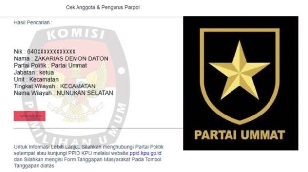 Melalui situs itu, tertera namanya dan NIK KTP sebagai Ketua Partai Umat Kecamatan Nunukan Selatan dengan Nomor KTA 6503091001.D.07887504.