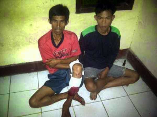 | Tersangka Slamet dan Amriwan di ruang tahanan Polsek Abung Barat. |