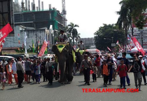 Suasana bertambah meriah dengan kehadiran satwa liar langka, dua ekor gajah jinak penghuni Taman Nasional Way Kambas (TNWK) Lampung Timur.