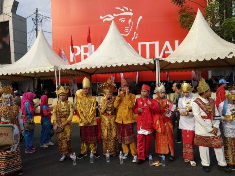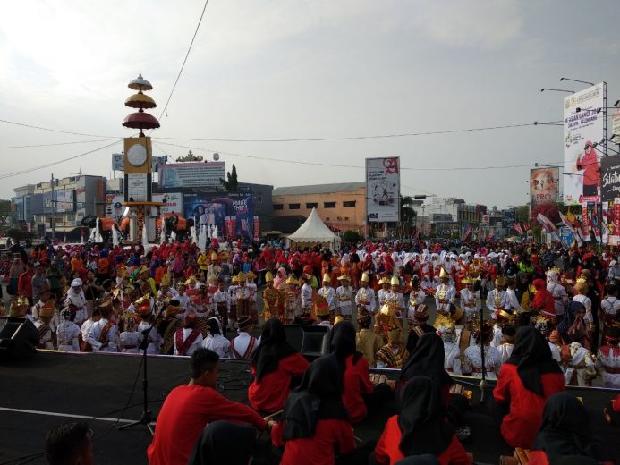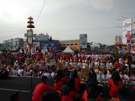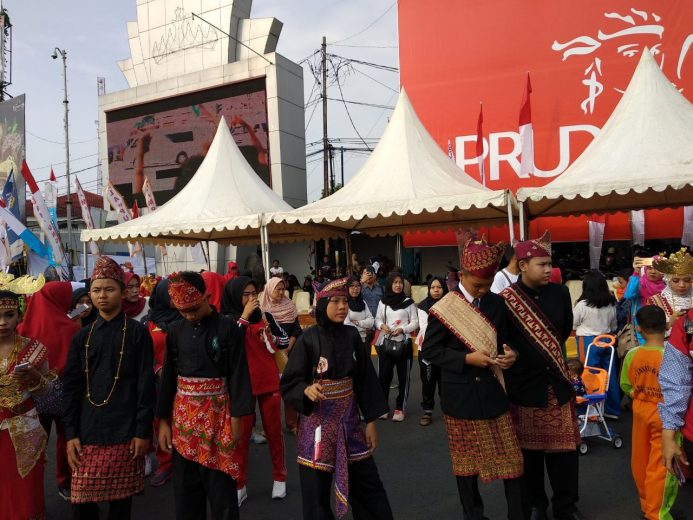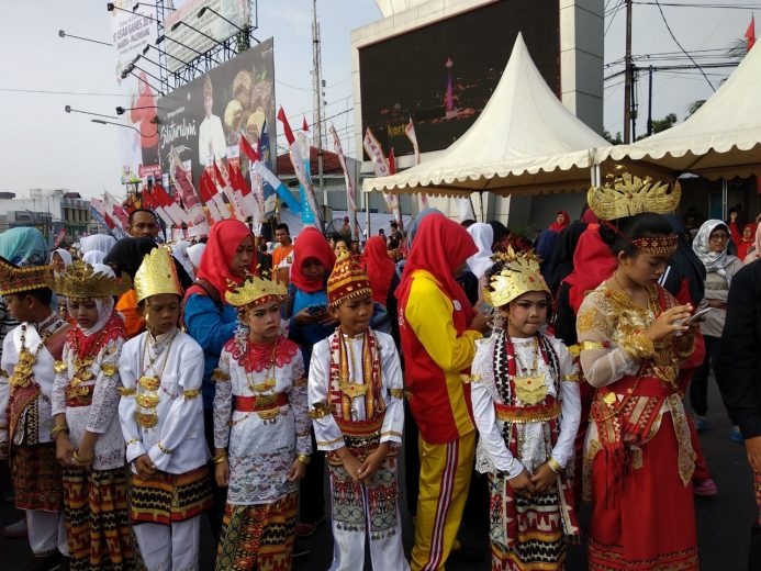 Di Tugu Adipura sejak pagi mulai dipenuhi warga baik yang hanya ingin menonton juga anak – anak yang berpakaian daerah untuk menyambut obor Asian Games.