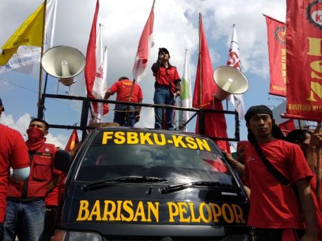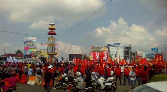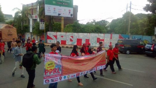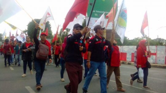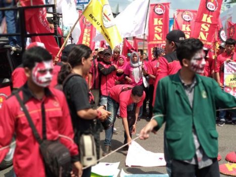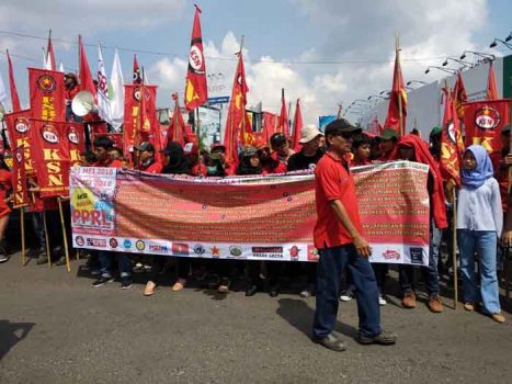 TERASLAMPUNG.COM — Ratusan masa buruh yang tergabung dalam Pusat Perjuangan Rakyat Lampung (PPRL) menggelar aksi damai untuk memperingati hari buruh se-dunia (May Day) yang dipusatkan di Bundaran Adipura, Enggal, Bandarlampung, Selasa 1 Mei 2018.