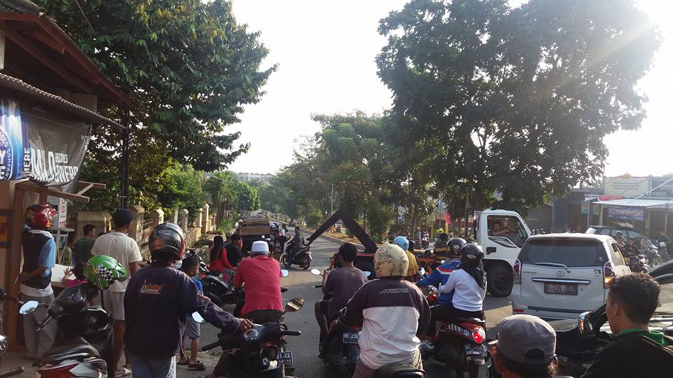 TERASLAMPUNG.COM — Kemacetan terjadi di Jalan Teuku Cik Ditiro, Kemiling, Bandarlampung, Minggu pagi (11/9/2016) sekitar pukul 7.00WIB. Penyebabnya: ada aktivitas petugas penderek untuk mengangkat angkot yang nyungsep ke siring.
