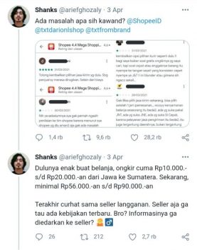 Akun itu membagikan tangkapan layar dari merchant Shopee yang mengeluhkan biaya subsidi ongkos kirim (ongkir) paket yang tidak adil sehingga para merchant harus menanggung selisih biaya kirim. Padahal biaya admin yang dikenakan sudah cukup tinggi. Kemudian, akun itu juga membagikan tangkapan layar lainnya yang berisi keluhan konsumen soal opsi jasa pengiriman yang semakin sedikit di Shopee sehingga mengurangi kenyamanan berbelanja.