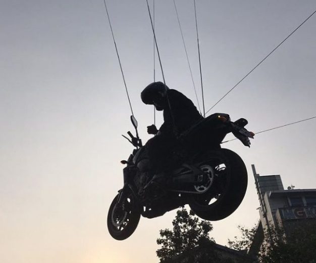 Presiden Jokowi lantas melakukan burn out lalu terbang melintasi truk untuk melewati kemacetan. Ia juga sempat melakukan rolling stoppie saat berpapasan dengan Bajaj, kendaraan roda tiga yang khas Jakarta.