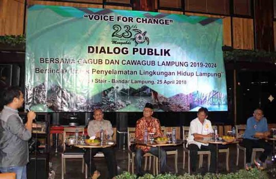 Dialo publik dalam rangka peringatan HUT 23 tahun Mitra Bentala itu dimoderatori wartawan senior Budisantoso Budiman dan didamping tiga panelis Rizani dari Mitra Bentala, Irham dari Walhi, dan Alian Setiadi (Ditektur LBH Bandarlampung).