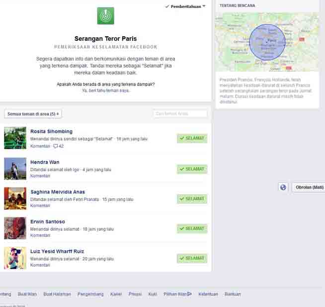 Cek keselamatan itu di Facebook bernama “Serangan Teror Paris” dan terhubung dengan tautan laman https://www.facebook.com/safetycheck/paris_terror_attacks/.