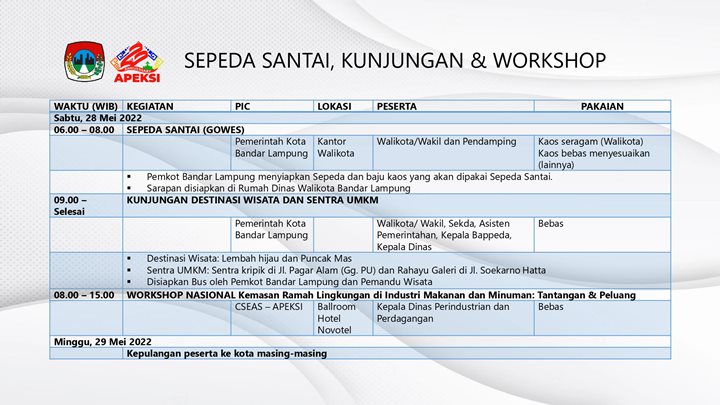 Sedangkan keesokannya, acara dimulai pagi hari ramah tamah para walikota atau yang mewakili dengan Walikota Bandarlampung Eva Dwiana dilanjutkan goes (naik sepeda) santai dimulai dari Rumah Dinas Walikota di Jalan Gatot Subroto.