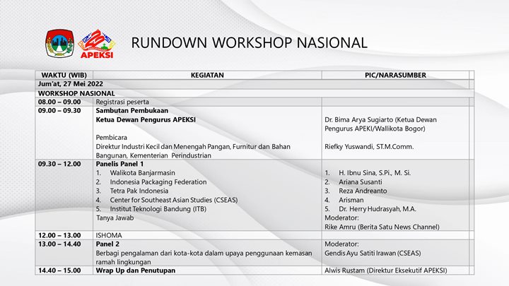 Pada saat yang bersamaan digelar pula Workshop Nasional yang temanya Kemasan Ramah Lingkungan di Industri Makanan dan Minuman Tantangan dan Peluang. Acara ini dibuka oleh Ketua Dewan Pengurus APEKSI Dr. Bima Arya Sugiarto yang juga Walikota Bogor sedangkan pembicaranya Direktur Industri Kecil dan Menengah Pangan, Furnitur dan Bahan Bangunan, Kementerian Perindustrian Riefky Yuswandi, ST.M.Comm.