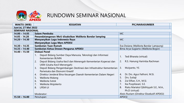 TERASLAMPUNG.COM, BANDARLAMPUNG — Peringatan HUT ke-22 Asosiasi Pemerintah Kota Seluruh Indonesia (Apweksi) akan digelar di Kota Bandarlampung pada Rabu – Jumat (27-28 Mei 2022).