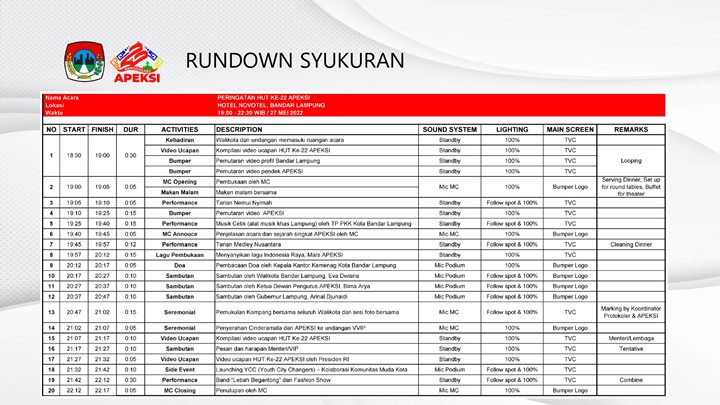 Sedangkan acara syukuran HUT Apeksi ke 22 yang mengambil tema Kebangkitan Ekonomi Melalui Kolaborasi Multi Pihak dimulai pukul 19.00 di Ball Room Hotel Novotel dan rencananya akan dihadiri Gubernur Lampung Arinal Djunaidi.