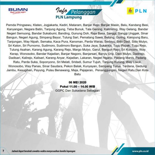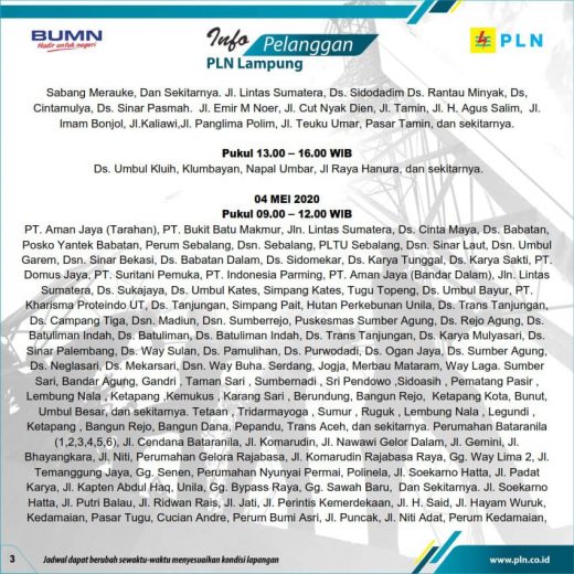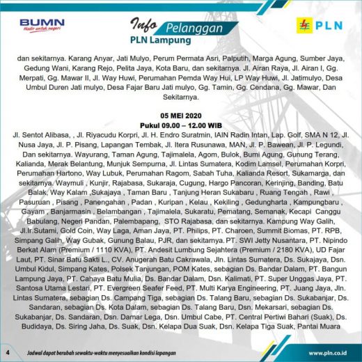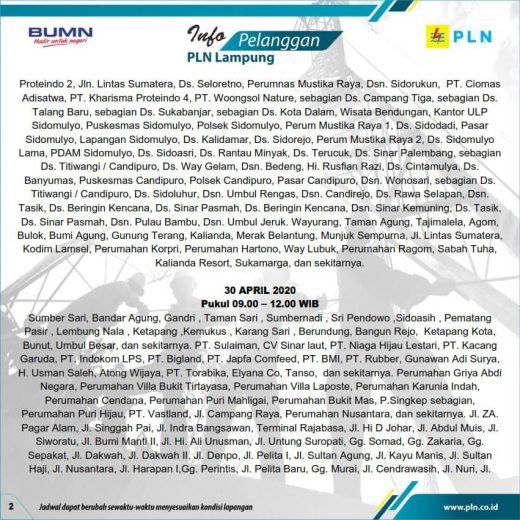 Menurut PLN, pemadaman itu dilakukan dengan alasan (seperti biasanya), yaitu “pemeliharaan jaringan listrik”. Terkait hal itu, PLN UP3 Tanjung Karang, UP3 Metro dan UP3 Kotabumi akan memadamkan aliran listrik pada tanggal 29 April sampai dengan 5 Mei 2020.